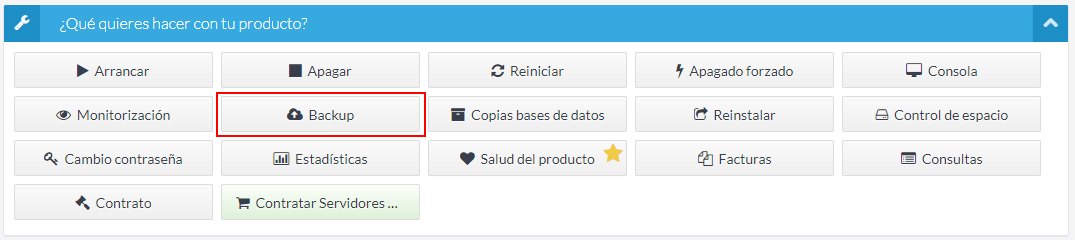 Dentro de la ficha del servidor, pulsa el botón Backup situado en el panel superior de herramientas.