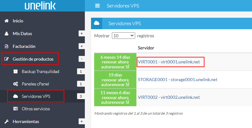 En el listado de servidores VPS, busca el servidor que tiene el Backup Tranquilidad activado y haz clic en su referencia.