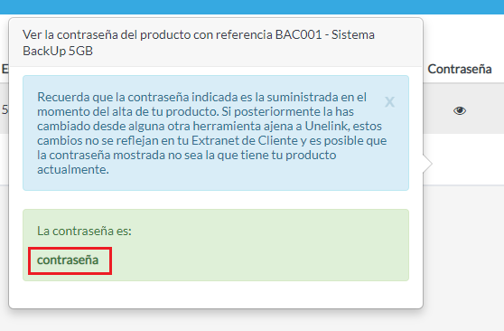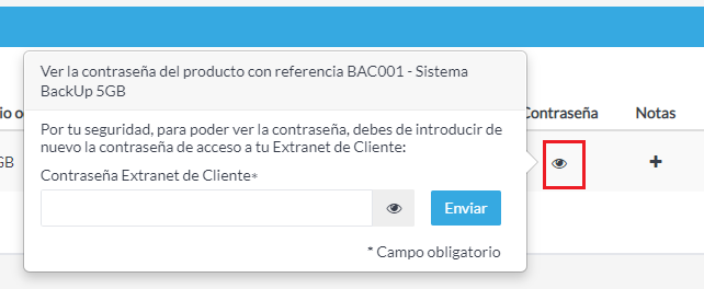 Introduce la contraseña de acceso de tu Extranet de Cliente, pulsa Enviar y, si la contraseña introducida es correcta, se mostrará la contraseña del usuario del Sistema de Backup.