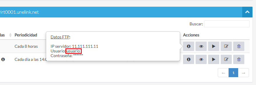 Pulsa el botón de información y consulta la IP y el nombre del usuario del Sistema de Backup en el que está subida la copia.