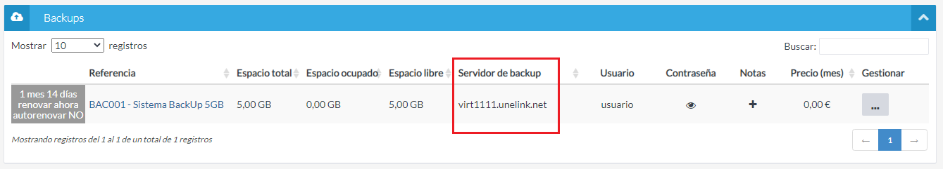 Ahora accede al listado de backups para consultar el servidor y la contraseña de ese usuario. En "Gestión de productos -> Backups" y busca el usuario.