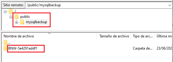 Una vez tengas abierto el cliente FTP, introduce la IP, el usuario y la contraseña y dentro del directorio "/public/mysqlbackup/" verás las copias de la base de datos para bajar.