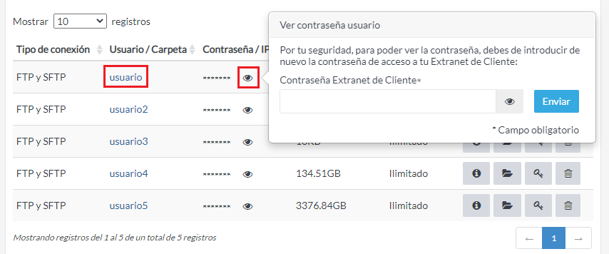 Introduce tu contraseña de acceso a la Extranet de Cliente y, si es correcta, se mostrará la contraseña del usuario FTP.