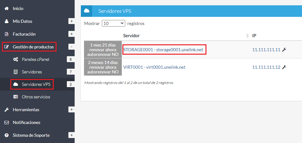 Ahora accede al listado de servidores VPS para consultar la contraseña de ese usuario. En "Gestión de productos -> Servidores VPS" busca la IP y accede al detalle del VPS Storage.