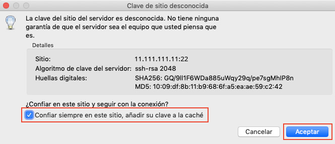 Si es la primera vez que accedes al servidor, FileZilla te avisará de que la clave de sitio es desconocida. Marca la casilla Confiar siempre en este sitio, añadir su clave en la caché y pulsa Aceptar.