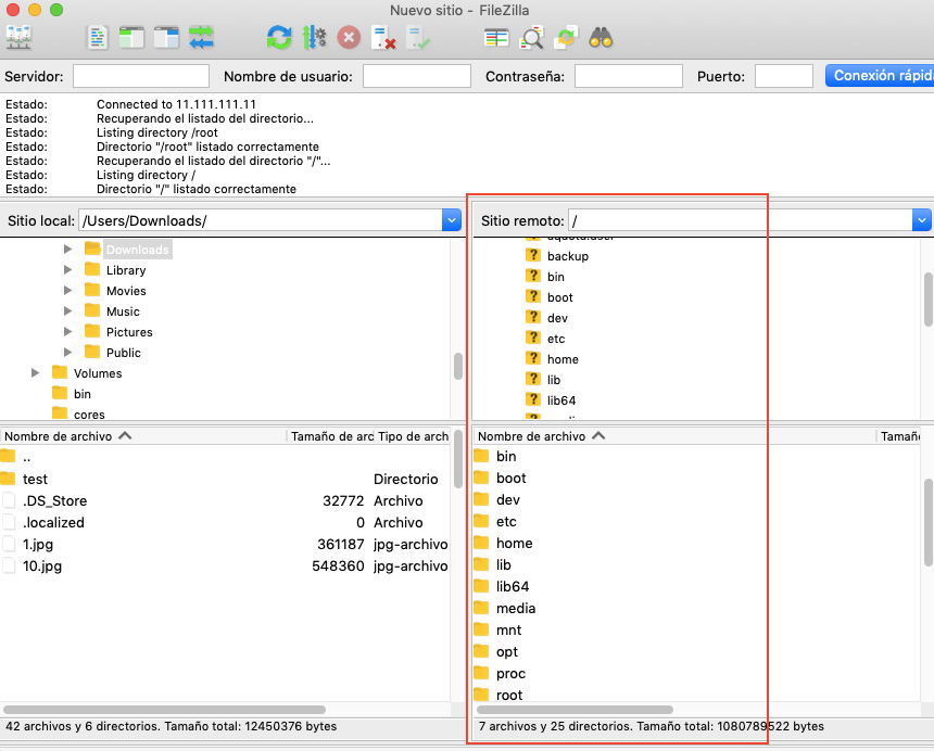 Cuando hayas conectado con el servidor, en la mitad derecha de la pantalla se mostrará el contenido del mismo que podrás arrastrar a la parte izquierda (tu Mac) para descargarlo. También puedes arrastrar de tu Mac hacia tu servidor si quieres subir ficheros.