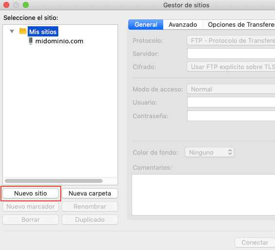 Dentro del gestor de sitios pulsa en el botón Nuevo sitio.