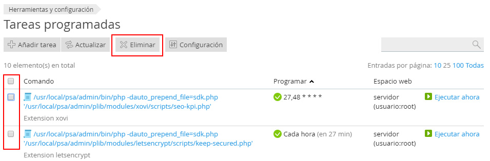 Una vez añadida la tarea aparecerá en el listado, desde donde podrás ejecutarla manualmente haciendo clic en el enlace Ejecutar ahora o modificarla haciendo clic en el comando.
