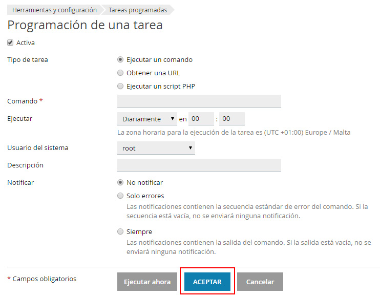 Rellena los campos del formulario y pulsa el botón Aceptar para añadir la tarea cron.