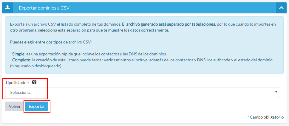 En la herramienta de exportación podréis elegir entre dos tipos de exportación: simple y completa. La exportación simple es un tipo de exportación rápida que incluye la información de los contactos y DNS de cada dominio. La exportación completa, además de incluir estos datos, también incluye los authcodes y el estado de bloqueo (en caso de que el dominio tenga ambas propiedades). Seleccionad el tipo de exportación deseada y pulsad el botón "Exportar".