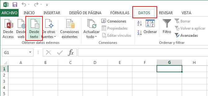 Por ejemplo, para importar este archivo en Microsoft Excel debéis abir el programa y pulsar en la opción "Desde texto" dentro de la sección "Datos".