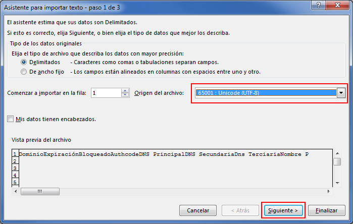 En el siguiente paso, seleccionad el fichero exportado y la codificación "UTF-8", para que se muestren correctamente los caracteres especiales, y pulsad el botón "Siguiente".