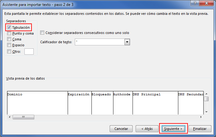 En el paso 2 seleccionad la separación por tabulaciones y pulsad el botón "Siguiente".