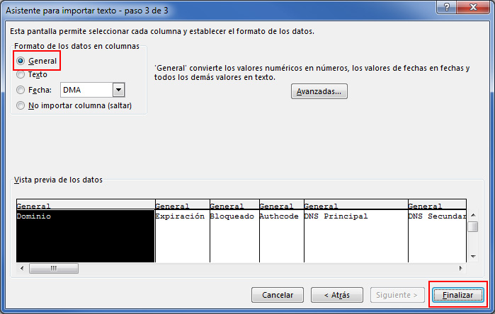 Por último, en el siguiente paso, elegid "General" para el formato de los datos en las columnas y pulsad el botón "Finalizar".