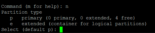 Una vez dentro de "fdisk", vamos a proceder a crear la nueva partición. Para ello teclearemos la letra "n". Te pedirá que elijas qué tipo de partición, nosotros tecleamos "p" que es la opción por defecto.