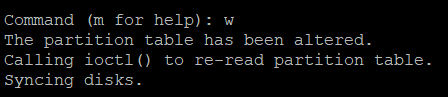 Una vez creada la partición, estaremos de nuevo en el menú principal de "fdisk". Si vemos que los ajustes que hemos hecho son correctos, solo nos queda confirmar los cambios. Para ello tecleamos "w" y se realizarán los cambios en el disco.