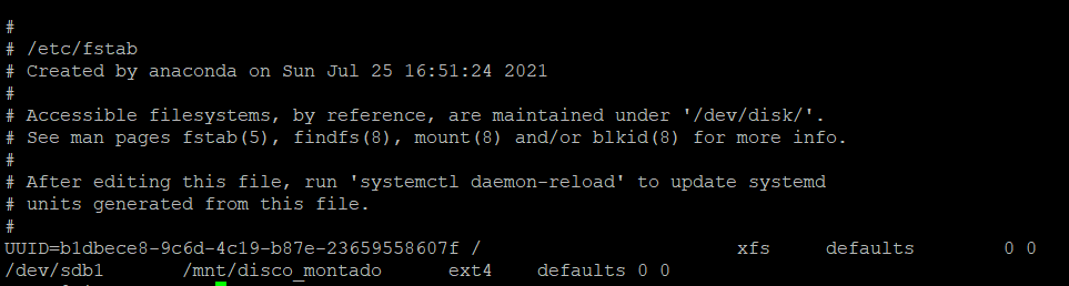 /dev/sdb1 /mnt/disco_montado ext4 defaults 0 0