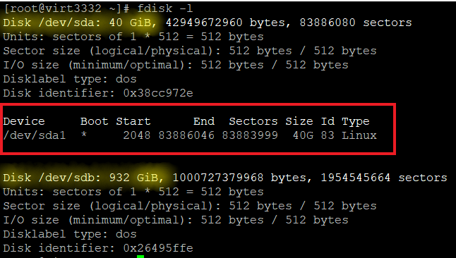 En el ejemplo anterior, subrayado en amarillo vemos los discos duros que existen en el servidor. Por un lado tenemos "sda" con un tamaño de 40GiB y por otro lado "sdb" con un tamaño de 932GiB. Además, en el recuadro rojo vemos como para el disco sda hay una partición de 40GB. La partición es sda1. En el disco sdb no aparece ninguna partición, por lo que entendemos que ese disco duro no tiene particiones.