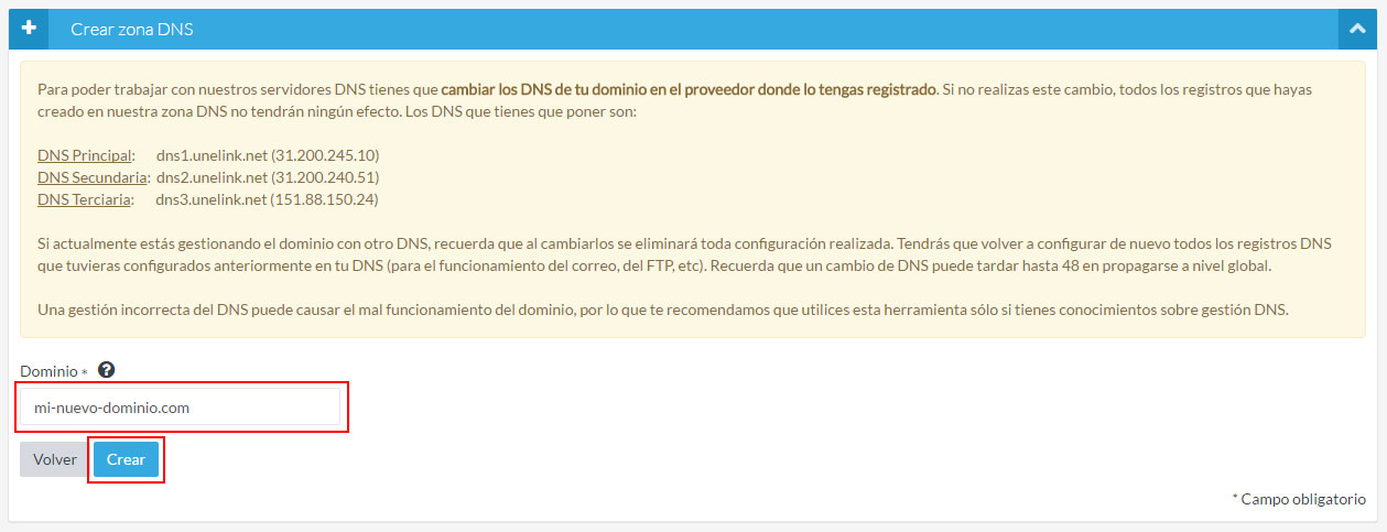 Escribe el nombre del dominio y pulsa "Crear". Recuerda que para que las zonas DNS funcionen tendrás que cambiar los DNS del dominio en tu actual proveedor por los DNS que se indican en esta pantalla.