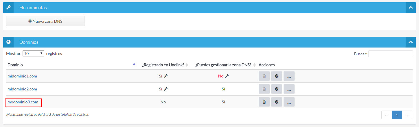 Una vez creada la zona, podrás gestionarla desde el listado. Para ello haz clic en el nombre del dominio para el que quieras gestionar su zona.