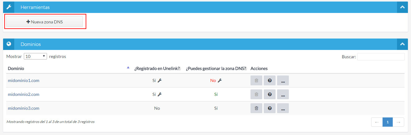 Verás un listado de todas las zonas que tengas creadas, así como de los dominios que tengas contratados con nosotros, ya que las zonas DNS de esos dominios también las podrás gestionar desde este listado. Para crear una nueva zona pulsa el botón "Nueva zona DNS".