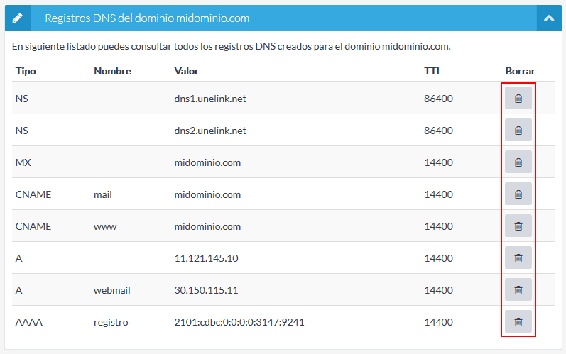 Cuando hayáis creados registros DNS para un dominio, en esta misma sección se os mostrará el listado de los que tenéis y podéis borrarlos en cualquier momento pulsando el botón "Borrar".