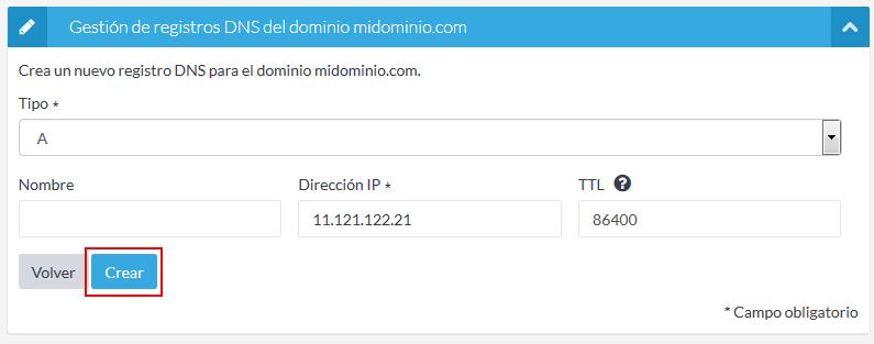 Una vez rellenados los datos del registr, pulsad el botón "Crear".
