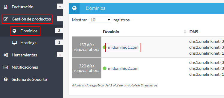 Para ello acceded a vuestra Extranet de Cliente y en el listado de dominios haced clic en el dominio al que queréis añadir un registro DNS.