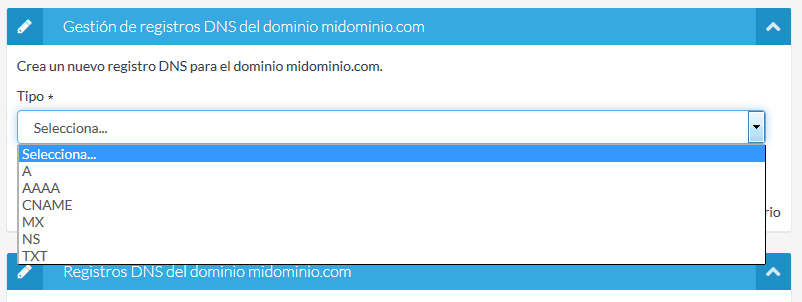 Con los DNS de Unelink asignados en el dominio y podéis gestionar sus registros DNS. Lo primero que tenéis que hacer es seleccionar el tipo de registro que queréis crear.