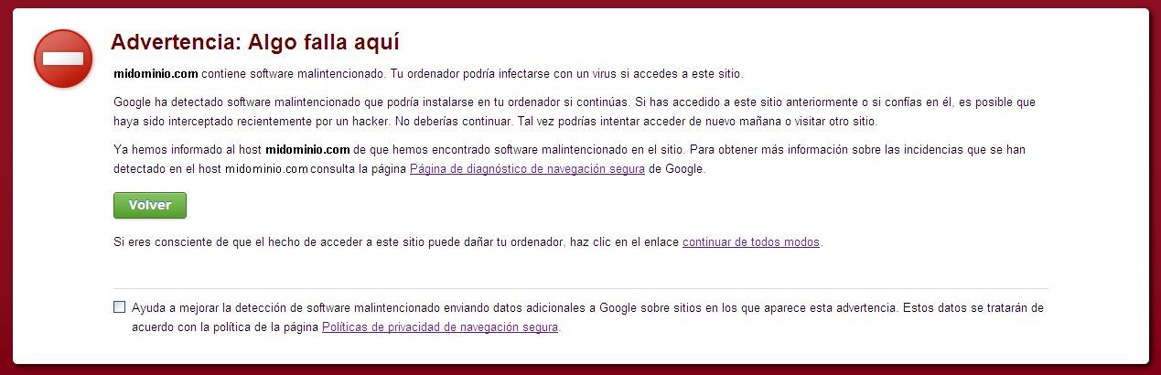 Es posible que tras limpiar un hackeo de nuestra web, al intentar entrar en la misma usando los navegadores Chrome o Firefox, nos aparezca un cartel de advertencia que indica que nuestro sitio contiene software malintencionado y que nuestro ordenador podría infectarse con un virus en caso de acceder a él. El cartel es distinto dependiendo del navegador desde el cual intentamos acceder.