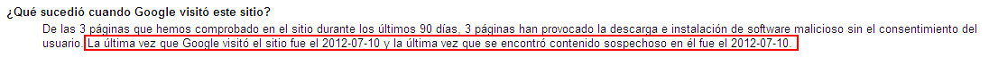 Si hacemos clic en ellos, se nos mostrará una página informativa de Google donde, entre otras cosas se nos informa cuándo fue la última vez que sus robots rastrearon nuestra página y cuándo fue la última vez que encontraron software malicioso:
