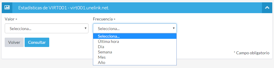 En el siguiente desplegable podrás elegir la frecuencia de las estadísticas. Las estadísticas son mostradas en formato gráfico y puedes elegir qué intervalo representar. Puedes escoger entre "Última hora", "Día", "Semana", "Mes" y "Año".