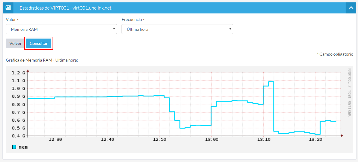 Una vez seleccionado el tipo y la frecuencia, haz clic en el botón "Continuar" para obtener la representación gráfica. En nuestro ejemplo vamos a seleccionar "Memoria RAM" y "Última hora".