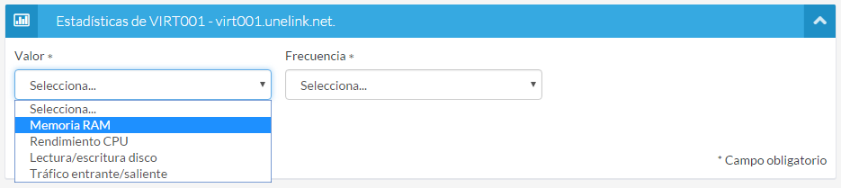 En la siguiente ventana podrás elegir para qué recurso de tu servidor deseas consultar las estadísticas. Puedes elegir entre "Memoria Ram", "Rendimiento CPU", "Lectura/Escritura en disco" y "Tráfico entrante/saliente".