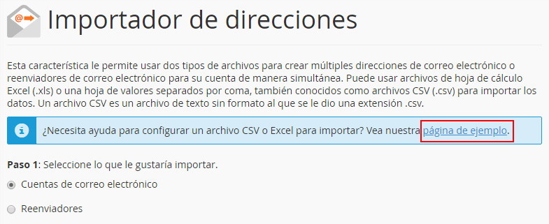 Si haces clic en "página de ejemplo", puedes ver el formato que tiene que tener el fichero importado.