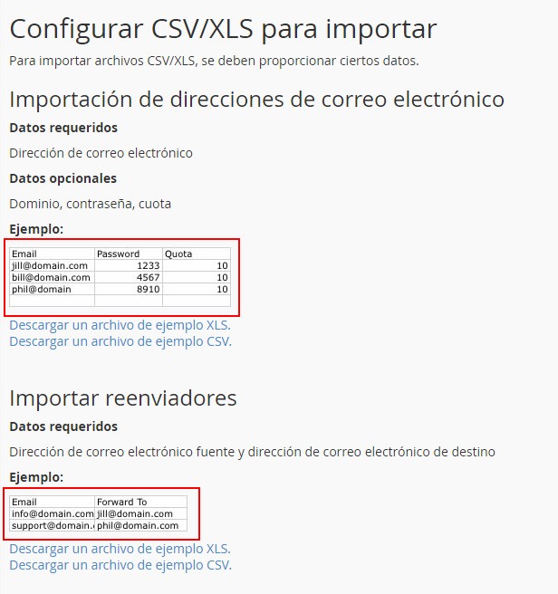 Si quieres importar cuentas de correo, tienes que indicar la dirección de correo electrónico, la contraseña y la cuota. En caso de querer importar reenviadores, tienes que indicar la dirección de correo fuente y la de destino.