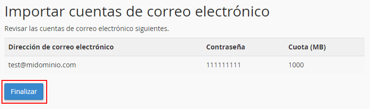 En el último paso comprueba las cuentas de correo que se van a importar y pulsa el botón "Finalizar".