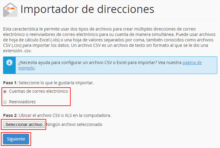 En el paso 1 del importador de direcciones, selecciona qué quieres importar. Puedes elegir entre "Cuentas de correo electrónico" o "Reenviadores". En el paso 2 carga el fichero .XSL o .CSV con las direcciones, contraseñas y cuotas de las cuentas de correo. En caso de querer importar reenviadores, en el fichero tienes que indicar la cuenta origen y el destino del reenvío. Finalmente, haz clic en "Siguiente".