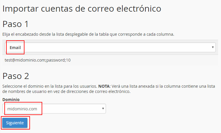 En el siguiente paso selecciona el nombre de la columna del fichero que corresponde a la cuenta de correo y el dominio en el que se crearán las cuentas.