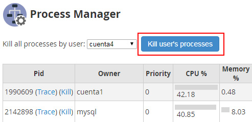 Selecciona la cuenta y posteriormente pulsa el botón Kill user's processes para matar todos los procesos de la cuenta.