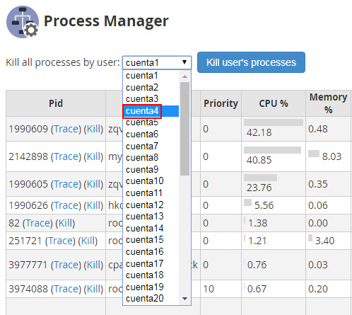 En la siguiente ventana puedes consultar todos los procesos que se están ejecutando en el servidor y las cuentas que los están ejecutando. En el desplegable de la parte superior busca la cuenta para la que quieres matar los procesos.
