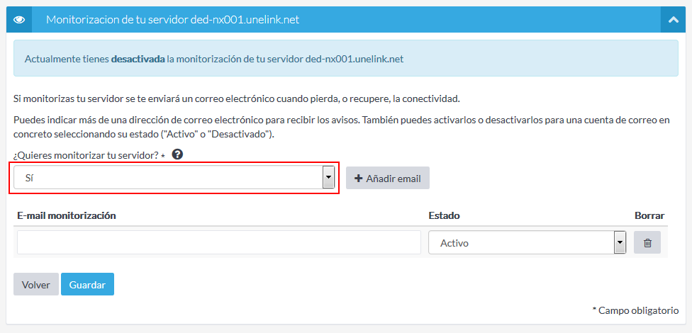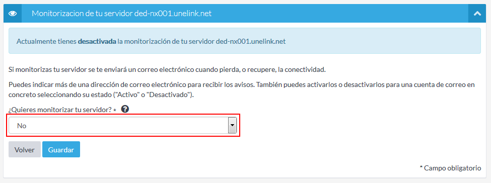 Si alguna vez deseas dejar de monitorizar tu servidor, selecciona la opción "no" en el desplegable "¿Quieres monitorizar su servidor?". Al seleccionar esta opción y pulsar sobre el botón "Guardar", tu servidor dejará de estar monitorizado y no recibirás ningún aviso.