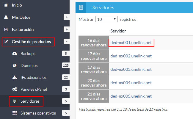 Al acceder a vuestra Extranet haced clic en el enlace "Servidores", dentro del apartado "Gestión de productos", para ver el listado completo de servidores. En él, buscad el servidor para el que queréis consultar las gráficas y haced clic en la referencia del servidor.
