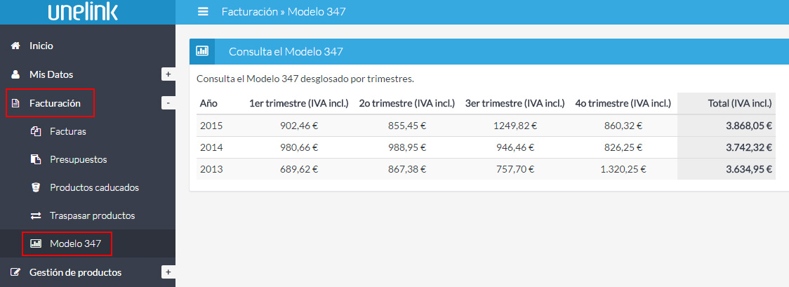 Podéis acceder al modelo en la sección "Modelo 347", dentro del apartado "Facturación". En él tenéis el importe, desglosado por trimestres, de aquellos años que han alcanzado el mínimo para ser incluidos en esta declaración de operaciones.