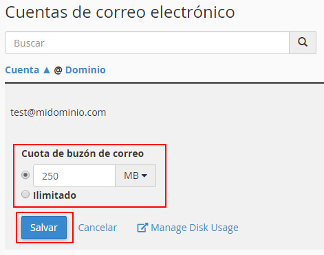 Indica el valor de la cuota que quieres asignar al buzón de correo y pulsa el botón Salvar.