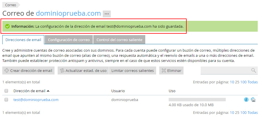 Una vez realizado el cambio, ya estará la nueva cuota asignada a la cuenta de correo electrónico.