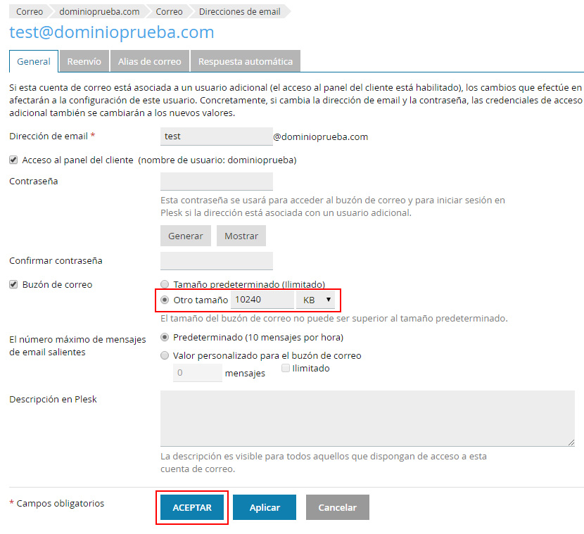 Indica el tamaño deseado para la cuota en el apartado Otro tamaño dentro de las opciones de Buzón de correo y pulsa el botón Aceptar.