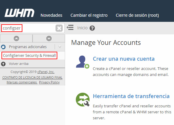En el buscador de la izquierda escribe "configserver" y haz clic en el enlace ConfigServer Security & Firewall.