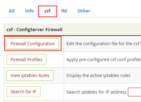 En la pantalla principal del CSF haz clic en la pestaña CSF y luego en la opción Firewall Configuration.