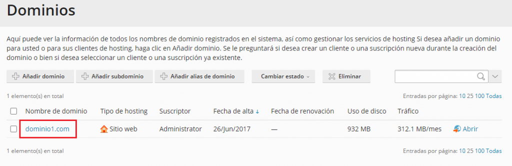 Nos aparecerá un listado con todos los dominios que se encuentran en nuestro servidor. Hacemos clic en el dominio que deseamos modificar el valor TTL del DNS.